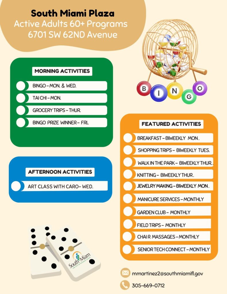 The South Miami Active Adults program offers a wide variety of services designed to enhance the well-being and engagement of its participants. These services include wellness activities such as fitness classes and health screenings, recreational and social programs like arts and crafts, games, and social events, and a weekly lunch program that fosters community and nutrition. The program also arranges field trips to local attractions and provides regular shopping opportunities—grocery trips take place weekly, while retail shopping is available every other week.